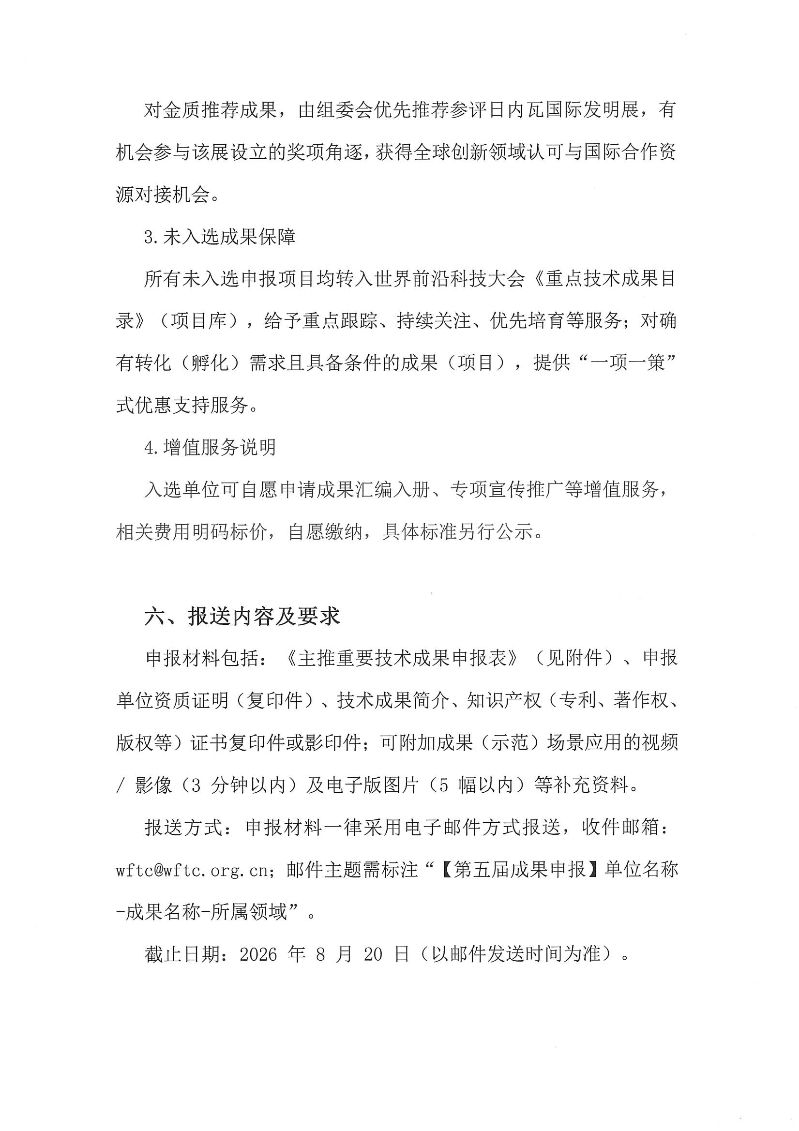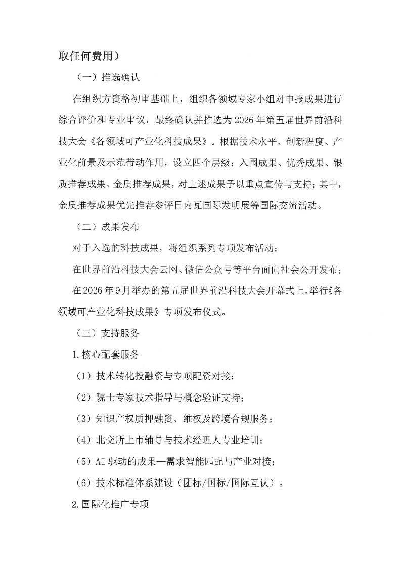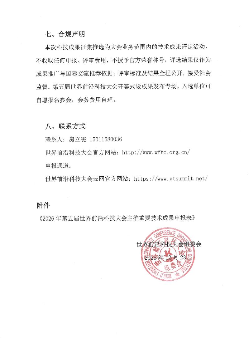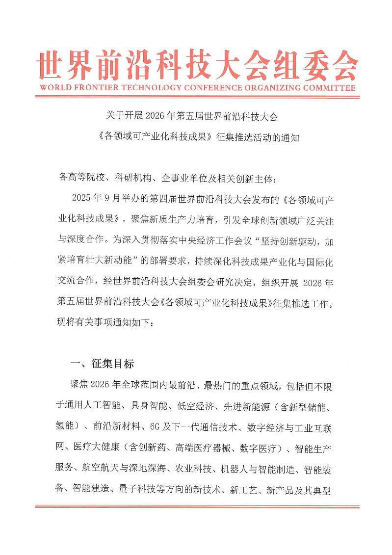关于开展 2026 年第五届世界前沿科技大会《各领域可产业化科技成果》征集推选活动的通知